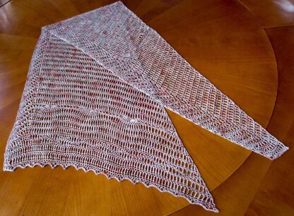 Open Mic Night II is a scalene triangle with a feather and fan edge and stitches worked on the bias. At different points, rows of waves are worked for interest. The pattern pdf includes four photos as well as a recipe idea for changing the scarf.