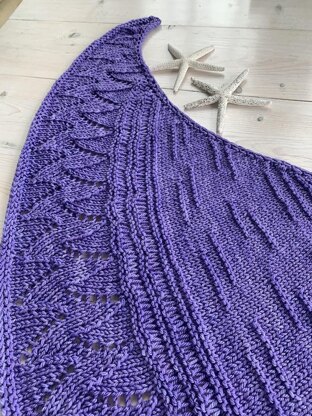 Open Ocean is an asymmetrical triangle shawl worked in DK yarn with a series of relaxing stitch patterns, including easy texture and simple lace, with a seaside theme. This beginner-friendly shawl is perfect for beach or travel knitting or knitting while chatting or watching TV.