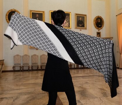 Opposite Views is an ‘almost rectangular’, two-color shawl knitted on the bias, alternating garter stitch and mosaic sections. The mosaic section in the second half of the shawl is the mirror image of the one in the first half, as it is exactly the same but with the colors used in the opposite order. The mosaic is easy but never boring to execute, making the shawl a relaxing but also fun knit.
