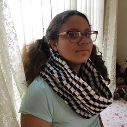 This is the second installment of my optical illusion series. This cowl is a generous 7" wide and 33" in circumference. The illusion of the blocks of black moving slightly in each set makes the lines, which are actually straight, look like they are slanted. So cool!