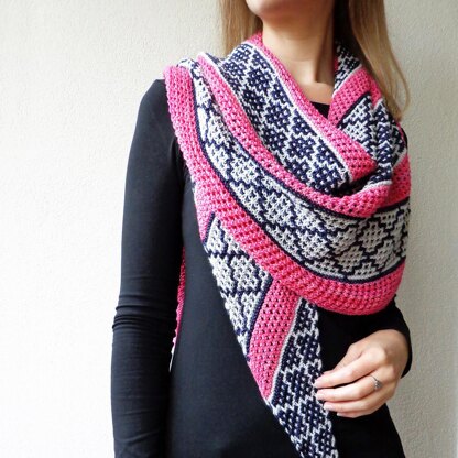 Worked as a sideways bias-knit triangle with a centred bottom tip makes it an enjoyable knit and easy to wear item.