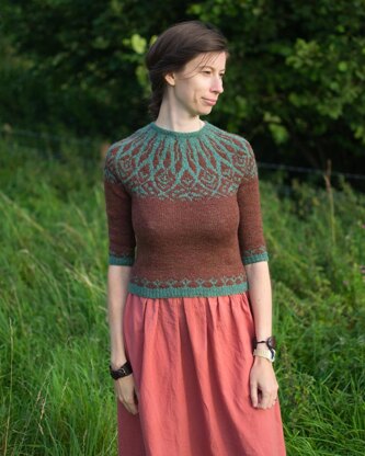 Opula is a colourwork yoke jumper, worked seamlessly from the top down, with a tubular cast-on for the neck and short-row shaping to raise the back neck. It features stranded knitting in two colours on the yoke, hem and cuffs. The neckband, hem and cuffs are worked in the contrast colour.