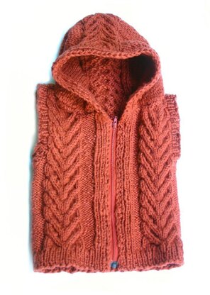 This sweater is quick and interesting to knit, with minimal finishing. The claw cables, one of which travels up the back and over the hood like a dragon's dorsal ridge, add to the organic feel of the design. The hood and the thickness added by the cables make this a cozy sweater for chilly days. Instructions are given for both long-sleeve and vest versions.