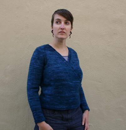 This flattering wrap sweater is designed for minimal seaming, with the body including front edging knit in one piece to the armholes. The sleeves are knit in the round before being sewn to the body. There is no built-in closure, which allows you to cinch the sweater tighter or looser depending on your preference – choose a size smaller than your actual bust measurement for the best fit – you can wrap the sweater looser for a custom fit.