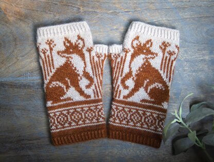 The Outfoxed Mitts pattern depicts an attentive Red Fox pausing to peer out from a gap in the reeds, her rusty coat accented by white fur on her chest and ears. Her white-tipped tail wraps around the outside of the hand, resting on the palm side of each mitt. Curious, intelligent, and often elusive, the fox is a common archetype appearing in fables and folklore throughout the world.