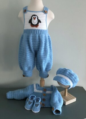 The file includes instructions for bubble overalls, a cropped jacket, Dutch boy cap, boy’s shoes, girl’s Mary Janes, a pumpkin applique, and a penguin applique. Crafters may choose the decorative button cuffs on the jacket and overalls or opt for simple crocheted rounds without the buttons. Specific yarns and yardage used as wells as tutorials for two special stitch techniques in the sample garments are also included.