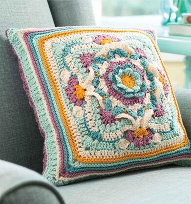 Detailed and beautiful floral overlay crochet square pillow. Made from a unique crochet technique that is meant to simulate aran or cabled stitches with textured or patterned dimensions using US size 4 worsted weight yarn. Includes step-by-step instructions and stitch guides to help you master this new age crochet trend. Intermediate skill level. Finished project measures approximately 14" in diameter.