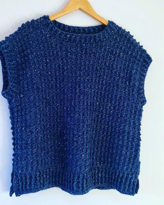 The easy two row repeat pattern for the front and back results in a textured fabric which is framed by a two repeat rib pattern at the end of front and back and then around armhole and neck line.
