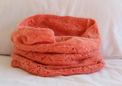 This giant oversized snood looks fantastic this season with any winter coat, sweater or even just to wear as an accessory. It has a great drape with a detailed lace stitch pattern. It is knit with a DK weight yarn at 5sts per inch on a #7 or 8 needle.