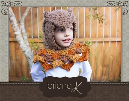 Owl Hooded Crochet Cowl is a perfect woodland look. Cute and functional this crochet cowl is worked from the top down with no hood seam! Sized from 1 year to adult it's great for winter or camping. Supplies Crochet Hook Size 9mm (M/N) Tapestry (yarn) Needle Scissors