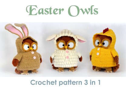 Owls in easter costumes, Easter Owls crochet pattern 3 in 1, English