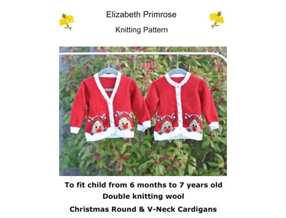 Knit our V-Neck and Round Neck Cardigans with a Father Christmas and Rudolph motif suitable to fit a child from 6 months to 7 years old**.**