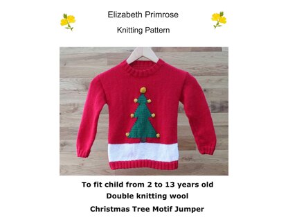 The jumper has a motif to the front of a Christmas tree complete with baubles and a pompom tree topper. The front, back and sleeves are knitted separately on straight needles and sewn together. Stitches are picked up to complete the neckline. The baubles are knitted separately and sewn on to the edges of each branch and a small pompom completes the top of the tree.