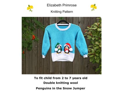 Knit our Penguins in the Snow Jumper suitable to fit a child from 2 to 7 years old