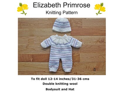 Knitting pattern no. 30 by Pizpaw Patterns. Bodysuit Hat to fit a doll 12-14”/31-36 cms.