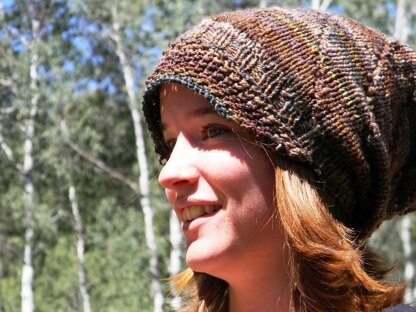 This hat is great for hand dyed or handspun yarns. The texture is simple enough to show off the colors and textures of the yarns while still adding a little bit of something extra. A subtle spiral pattern will not overpower or compete with the yarn you choose; rather, it will enhance the yarns’ natural beauty. This design is very unisex and the project can have a more decided gender with the fibers you choose to put with it. It is a suitable knit for beginners with only a few stitches and techniques used, not to mention it’s quick! The brim can be worn flipped up or down, and the hat would also look great if you decided to leave it brimless. Added slouch in the back of the hat will accommodate dreds and any hair that you want kept out of the way.