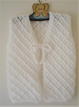 Girl’s lace cardigan (Style A) and vest (Style B), both with garter stitch bands and knitted i-cord ties. The cardigan has ¾ length sleeves.