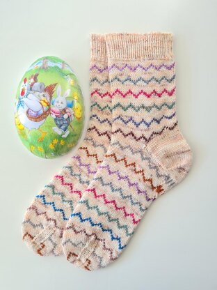 The pattern on the socks is inspired by the designs of hand-painted Easter eggs. The zig-zag pattern can be painted on the eggs either as narrow or wide stripes. By changing the colours, the socks can be true Easter socks or suitable for year-round use as colourwork socks.