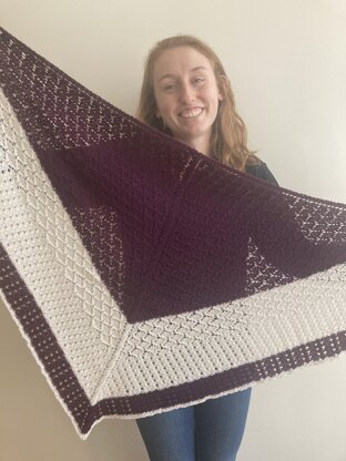 This shawl features three sections of lace (lattice lace, eyelets, and perforated rib) that are worked around a 4-stitch cabled spine. After blocking, the piece measures 67” wide and 33” along the center spine. I use two colors of We Are Knitters Finita yarn to add a bit more pop.