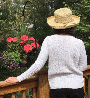 A casual V-neck with optional hood features a lovely cable and rib design. Worked from the bottom up and in the round with at slit at the hem. Worked to the underarn, and then front and back worked separately,