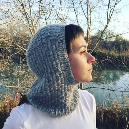 The balaclava is made top-down. First the square on the top is made and then some stitches are picked up from sides. It is worked back and forth on round needles. Then is closed up in the round for the neck part.