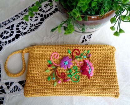Paradise Purse Bag, beautiful crochet and embroidery little bag to use for your cosmetics, knitting and crafts tools or just to carry your money and keys, zippered and wristlet bag, fully linen, pattern include picture tutorial and step by step instructions to make the complete project, you will love it!