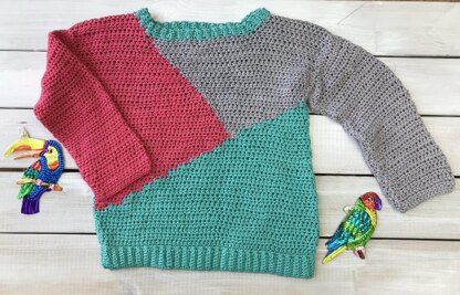 This is a bright, colour block jumper for children with diagonal lines across the front. The jumper is made from the bottom up, has drop shoulder sleeves and the colour changes are made using intarsia. It is inspired by 80s sportswear and the bright plumage of parakeets. The simple shape and stitch pattern allow the bright colours and glossy yarn to take centre stage. The loose casual shape will make it easy to wear and lots of kids will love the bright colours.