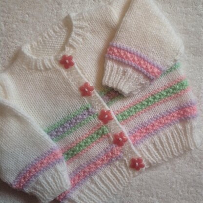 This lovely little cardigan with pastel colours will look great with any girls outfit. With the delicate colours it will go with most little outfits. Knitted in one piece to the armhole makes less seams to sew. The sleeves are set in sleeves, eased in when sewing up.
