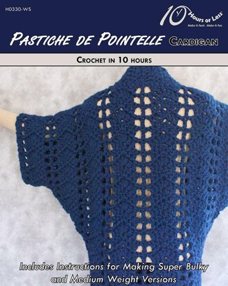 Crochet classic fashion with a quick, kimono-style cardigan! Worked in one piece, this knee-length cover-up features an allover pattern of petite pointelle lace. Sporting three-quarter sleeves and a high neckline, the sophisticated silhouette provides the perfect complement to any ensemble. And with instructions for both super bulky and medium weight versions, you can stylishly span all four seasons.