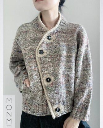 Patch cardigan is driven by the idea of putting twists on classics. This oversized garment features curved front closure, patched buttonholes, overall accent collar-front trim and slanted insert front pockets. Cardigan is worked from top down in stockinette stitch in one piece.
