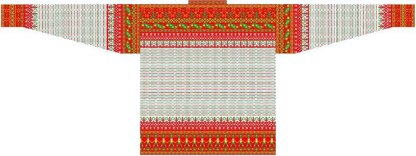 The waistline, yoke and cuffs of the sweater (diagrams with red background, 35-40% of the sweater's surface) are made in tapestry crochet, and the central parts (the diagram with white background) are knitted. Traditionally, the colours are off-white, red, green and yellow.