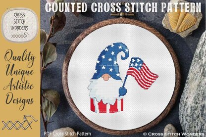 An Adorable Patriotic Gnome with a Flag counted cross stitch design!\nCross Stitch Pattern designed by Marcia Manning.\n98 stitches wide by 98 stitches high.\nPDF is a COLOR counted cross stitch chart which lists suggested DMC floss colors, and includes a color picture.\n\nStitched design size is as follows:\nSize 11 count: 8.91 x 8.91 inches or 22.63 x 22.63 cm\nSize 14 count: 7.00 x 7.00 inches or 17.78 x 17.78 cm\nSize 16 count: 6.13 x 6.13 inches or 15.56 x 15.56 cm\nSize 18 count: 5.44 x 5.44 inches or 13.83 x 13.83 cm\nSize 22 count: 4.45 x 4.45 inches or 11.31 x 11.31 cm