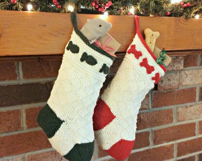 Choose either fish or bones to ring the cuff of this simple stocking. Knit in the round from the toe up, it features a short-row toe and heel in contrasting colors. An all-over diamond pattern adds texture. The bones and fish are knit separately and sewn on later.