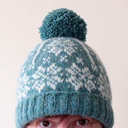 The hat is worked in the round, from brim to crown. Instructions for the stranded colourwork pattern and crown shaping are given in a chart.
