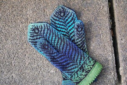 Here it is, another Peacock Feather design! My deepest gratitude to Petra for her beautiful sample mittens. She made me want to make a pair for myself, in exactly the same colors! However, if you decide to do it differently, you can easily turn your Peacock Feather into a Firebird's one. Size-wise, this pattern is supposed to produce a S/M pair if you use some fingering-weight yarn. But you will get M/L if you switch to sport-weight. Also check these peacock-feathered patterns: http://www.ravelry.com/patterns/library/peacock-feathers-mittens and http://www.ravelry.com/patterns/library/peacock-feathers-4