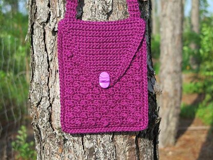 Quick, easy, and fun to make, this envelope-type purse has a pretty pebbled pattern created by a ball stitch. The 6 inch by 8 inch size will also accommodate some electronic tablets. Shoulder strap is 24 inches. One button or bead is used for securing the front flap.