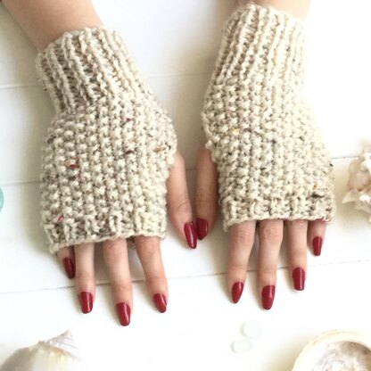 A fun and easy knit, with yarn and stitch design mimicking pebbles on a beach. Just right for cooler days. Fingerless means fingers free for fiddly tasks.