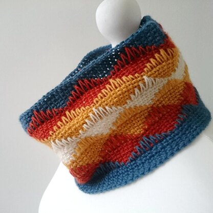 Pen y Fan Cowl is worked in the round using US single crochet / UK double crochet stitches. Every sixth row uses spike stitches to create a ripple wave effect.