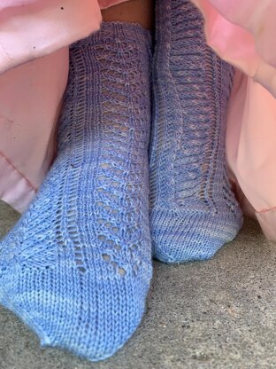 The socks feature columns of lace and cables. Lace for the feminine side with cables to represent her determination and strength.