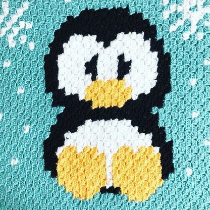 A soft baby blanket featuring a bold penguin and snowflake background.