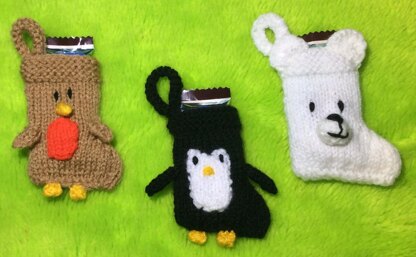 This knitting pattern is for three christmas stocking tree decorations with a robin, penguin and polar bear characters.