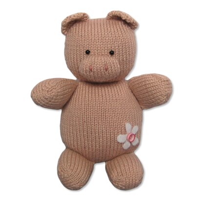Penny Pig is playing in the spring sunshine. This pig is knitted in stockinette, and uses simple increases and decreases for shaping. Designed by Amanda Berry @fluffandfuzz, the pig is knitted in DK yarns on single pointed needles (not in the round), and the pig’s tail is an i-cord tube worked on two DPNs. For confident beginners and above, other techniques used include casting on and off, knits, purls, a kfb increase, and ssk and k2tog decrease, and seaming to finish.