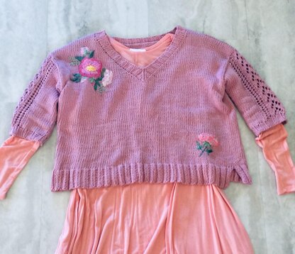 Peonies Pullover is a boxy V neck cotton pullover with simple lace panel on the sleeves, and embroidered detail. It’s a perfect spring and summer garment, that can be worn with dresses, skirts, shorts, and jeans.