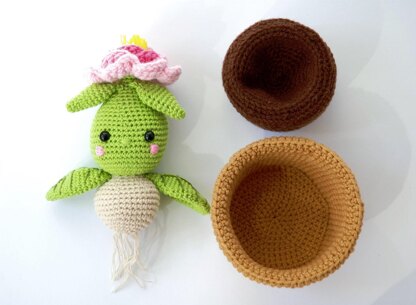 All the parts of the flower are crocheted in one piece, except for the leafs, they are sewn on at the end. The soil and flower pot are crocheted separately.