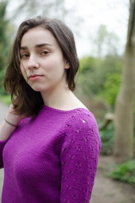 The top is worked in seamlessly in the round from the collar down, with raglan yoke and polka dot sleeves. The yoke is divided for the sleeves and body at the underarm, to be knitted in the round toward the hem and cuffs. No finishing is required apart from weaving in ends.