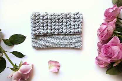 A small clutch bag made in T-Shirt yarn, using moss stitch and puff stitch primarily. It’s made in one rectangle and sewn together at the sides, with a wrap around chain closing.