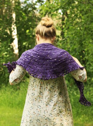 Perforate is a crescent-shaped shawl. Instead of a visible center, the pattern cleverly incorporates increases within the lace itself. The pattern is charted, wrong side rows are purled. Perforate requires 300-650 meters of fingering or sport weight yarn and is easily enlarged by adding repeats.