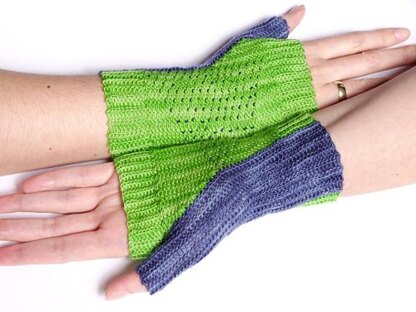 When I planned My Year of Mitts, I really wanted to make mitts with beads. And as life rushes by, they have only come at the very last month. Beads look very pretty, but they also slow down crocheting. As such, I chose a geometric pattern so you do not have to worry so much about the placement of each bead. I made the mitts two-color because I like to buy beads just right for the yarn — but if I had used blue beads on blue yarn, you would not have been able to see anything of them. And because I also wanted to use just the right blue, there is the blue thumb. The mitts are made of slip stitches so that they fit snugly on the hand. The lace yarn lets them be very delicate and fine.