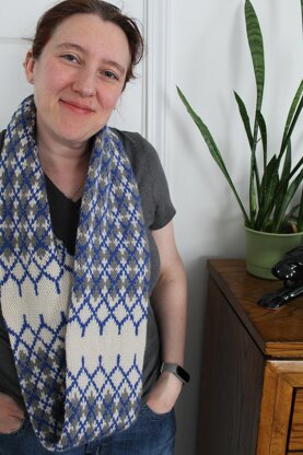 Persistent Rhombi is a three color stranded colorwork cowl. It features a stunning argyle pattern that fades in and out in three sections. It begins with a provisional cast on, then is knit in the round in a long tube, and finally Kitchener stitch is used to graft the ends together. Knit using Phoebe by Quince & Co., it’s silky, bouncy and soft with gorgeous, radiant colorways!