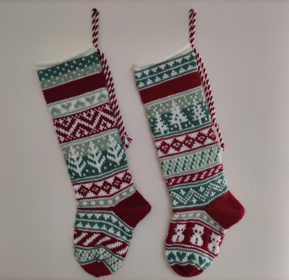 These stockings are knitted cuff down in the round with a short row heel and wedge toe which is grafted using Kitchener Stitch. There are two designs to choose from. The stockings can be personalised with a name using duplicate stitch after the stockings have been knitted. The stockings are finished with a candycane-striped rope for hanging on the mantlepiece.